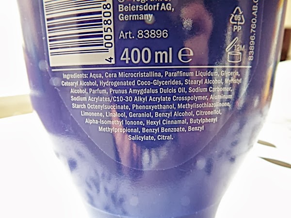Balsam jest bardzo lekkiej konsystencji, zamykany na klik, który jest bardzo wygodny podczas kąpieli, gdy nasze ręce są mokre, niestety butla jest dość śliska i czasem może nam wypaść z ręki, a jak wypadnie takie 400 ml na nogę, to już nie jest przyjemność pod prysznicem. dlaczego kupiłam ten produkt? Bo byłam bardzo ciekawa, ale nie chciałam na niego wydawać zbytnio dużo pieniędzy, więc wybrałam się kiedyś do SuperPharm i był w promocyjnej cenie 17 zł za 400 ml opakowanie, czyli tak naprawdę kupiłam duże opakowanie w cenie małego. Wybrałam wersję do skóry suchej, choć takiej nie posiadam, ponieważ od kiedy myję ciało żelami o naturalnych składach, moje ciało nie przesusza się i nie traci naturalnej warstwy lipidowej skóry. Czasem może zdarzy mi się to na łokciach czy kolanach, ale to przecież normalne, nasza skóra złuszcza się codziennie, ale wtedy przychodzi mi z pomocą peeling. Nie lubię tłustych kremów do rąk, ani maseł do ciała, generalnie jestem anty balsamowa. Nienawidzę tej mumifikacji, kiedy wszystko się klei, trzeba czekać aż wchłonie bleeee.